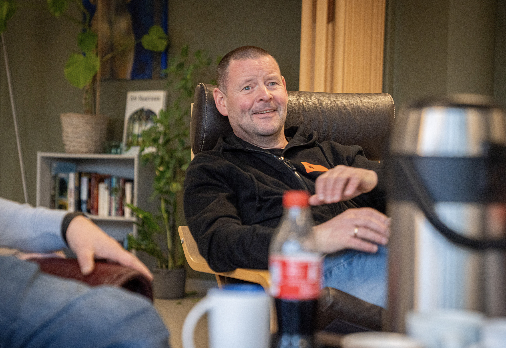 Med hver vår kaffekopp med ulikt motiv setter vi oss ned i en av sofagruppene i fellesstuen.