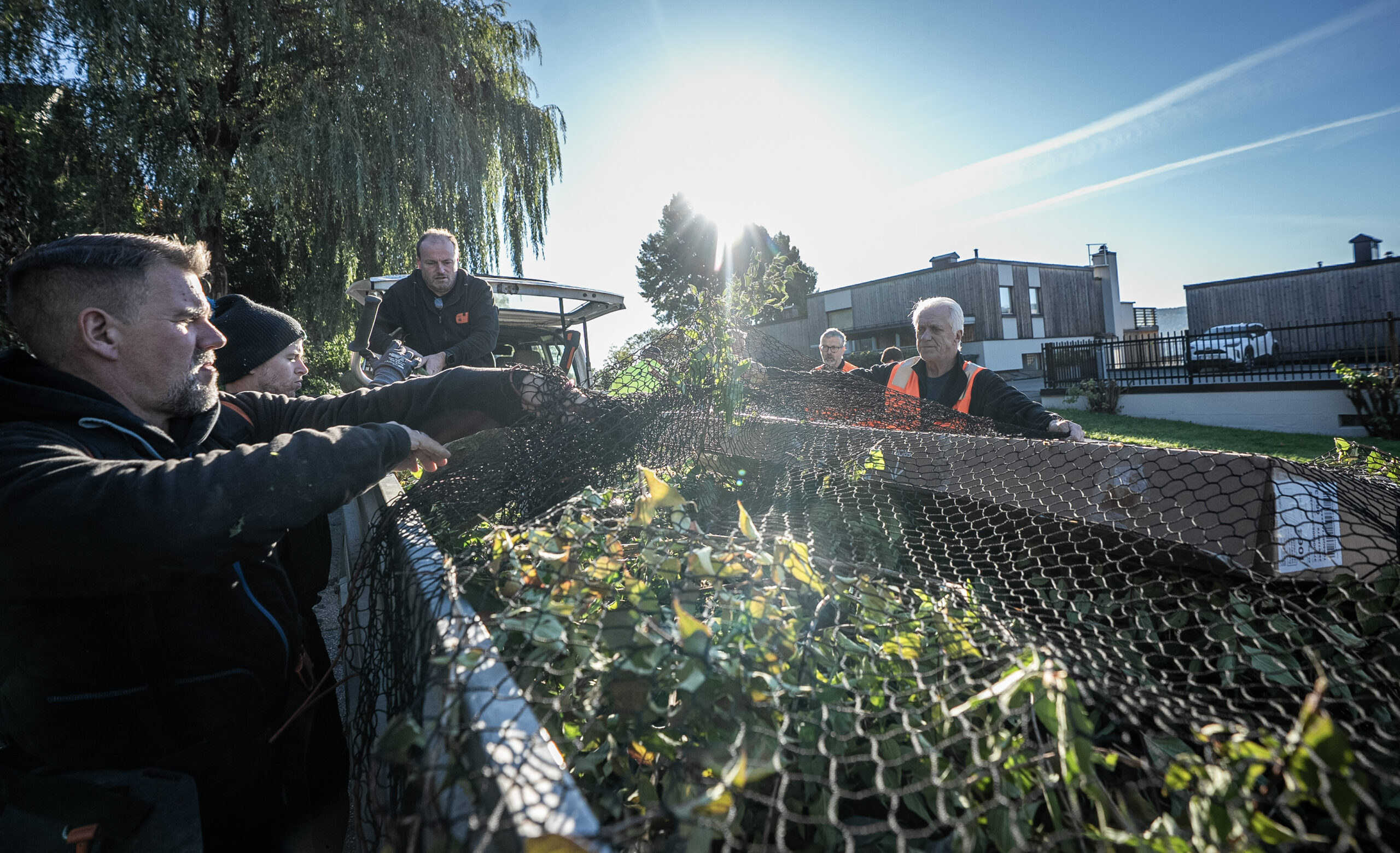 Han hilser på alle og forklarer dagens gjøremål: Hengeren skal fylles med hageavfall, som deretter skal kjøres til avfallsstasjonen. I tillegg er det hagearbeid som må gjøres, og de skal hente ved.