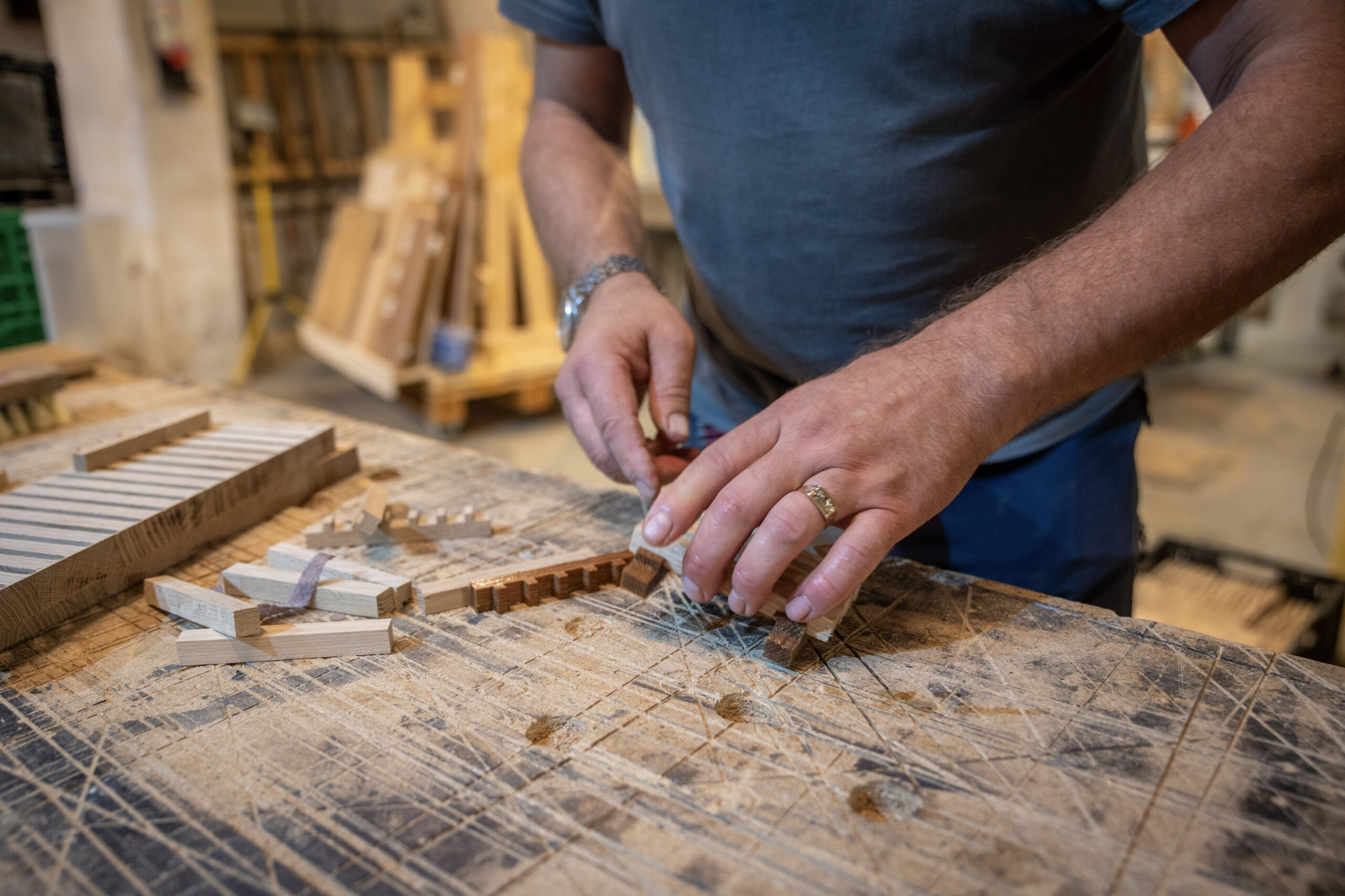 Han rusler rundt i Kirkens Bymisjons verksted I jobb, Fredrikstad. Plukker møysommelig noen trebiter fra en kasse på gulvet og legger dem på den store trebenken. I en kasse ved siden av ham ligger mange ferdige såpeskåler som skal selges i nettbutikken til Kirkens Bymisjon.