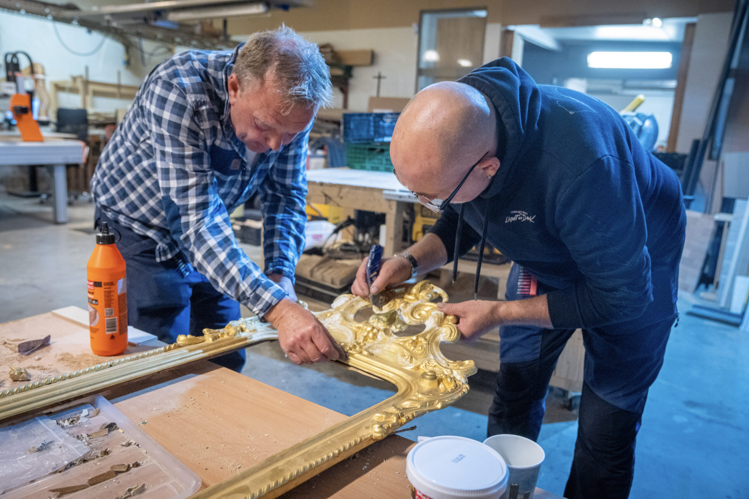 Tilbake i verkstedet står Jarle og Thomas og ser på en massiv, forgylt speilramme. Etter at den ramlet i gulvet hjemme hos eieren, gikk deler av rammen i tusen knas.