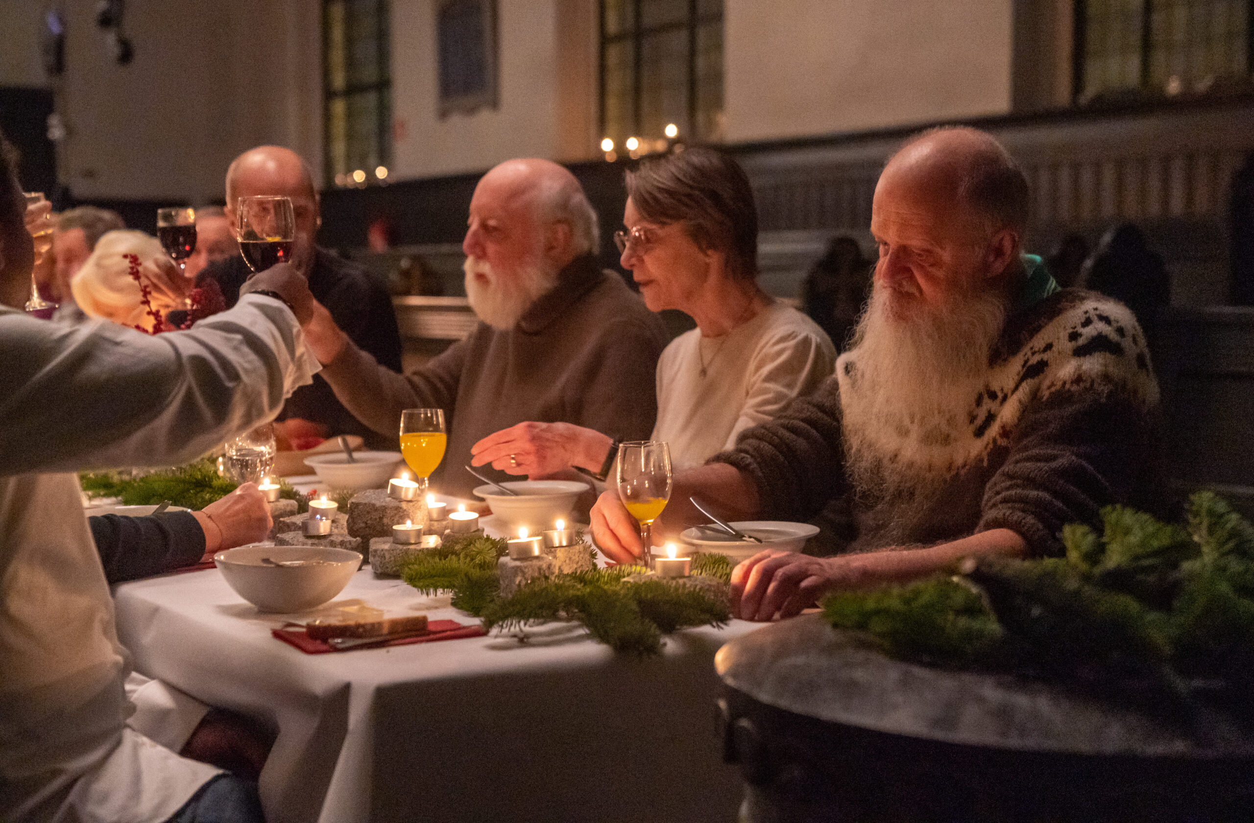 Klokken er 18.30 på en torsdag før jul og vi har samlet en gjeng av våre gjester til en uforglemmelig kveld. De er i ulike aldere, ulike bakgrunner. Noen er utadvendte, andre trenger tid. Men idet maten serveres – suppe, brød og brus – skjer det magiske som så ofte finner sted når ulike mennesker møtes for å bryte brød sammen.