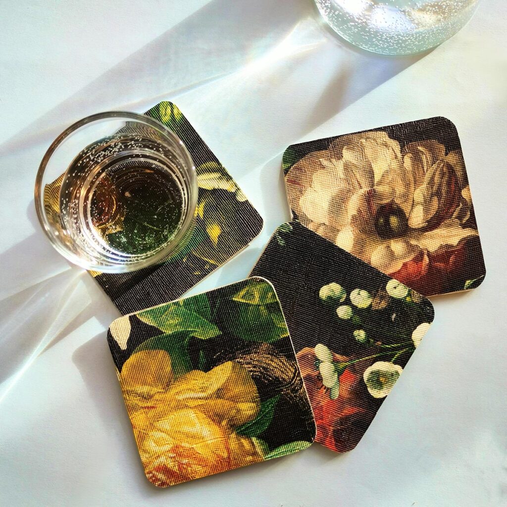 Dekorative brikker for å beskytte bordet for varme og kalde glass og kopper med drikke. Drikkebrikkene kommer i pakker av fire stykker.