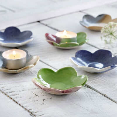 Nydelig skål som er håndlaget i keramikk, formet som en vakker blomst. En fin dekorasjon på bordet, bare som den er eller til et lite lys, eller teposen.