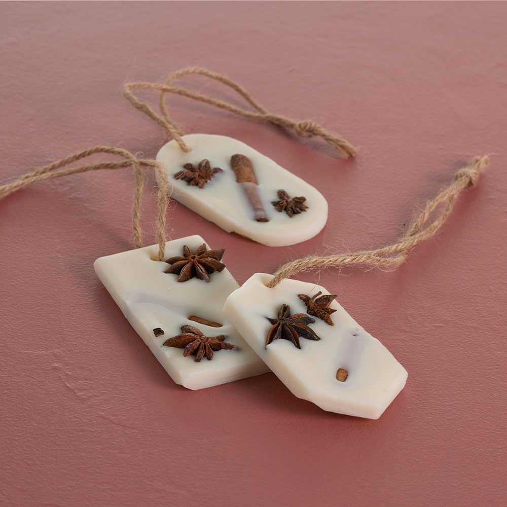 Nydelig lukt og fint pyntet med en lavendelkvist. Laget av naturvoks og tilsatt eterisk olje av lavendel. Dekorative og kan plasseres der man ønsker en god lukt. Leveres i pakke med 3 stk.