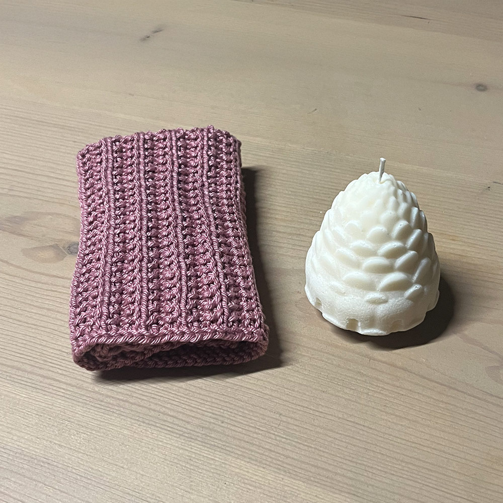 En gavepakke som består av en strikket kjøkkenklut i bomull og et konglelys.