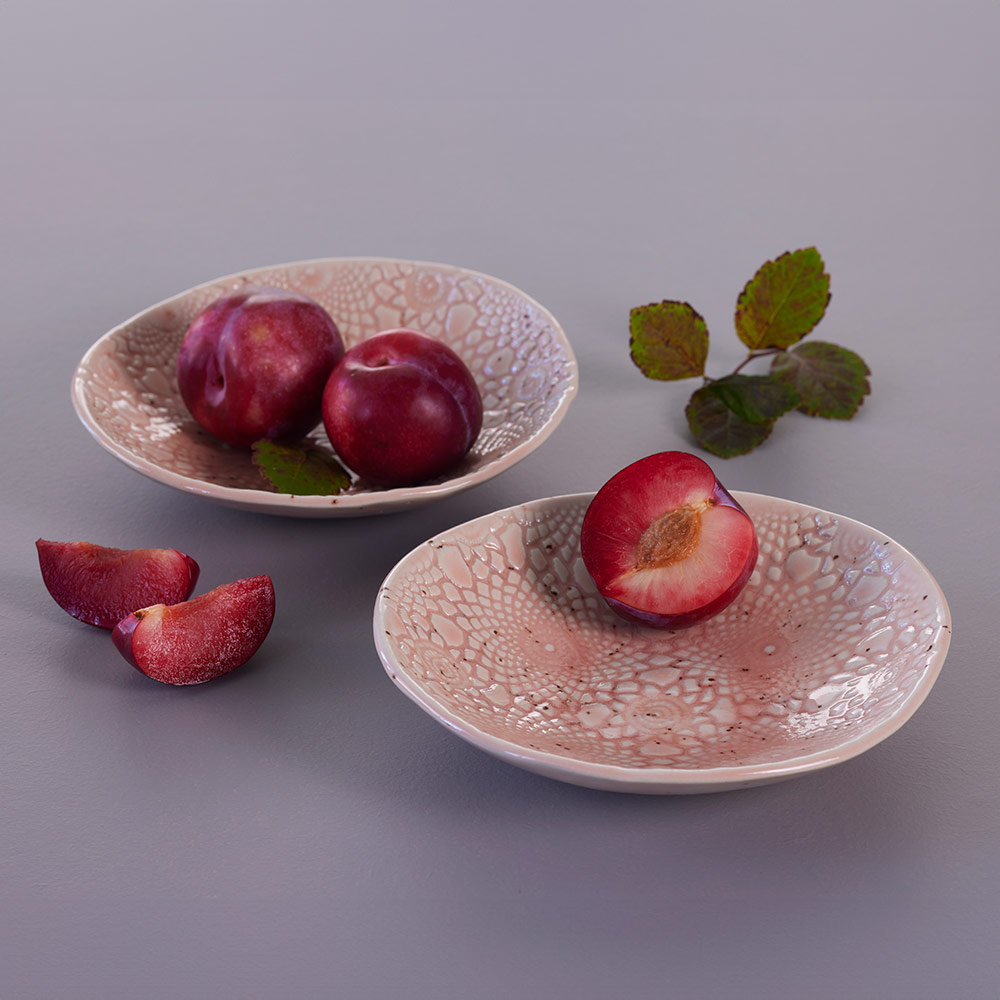 Et dekorativt blondefat, eller en vakker tallerken, laget i keramikk.