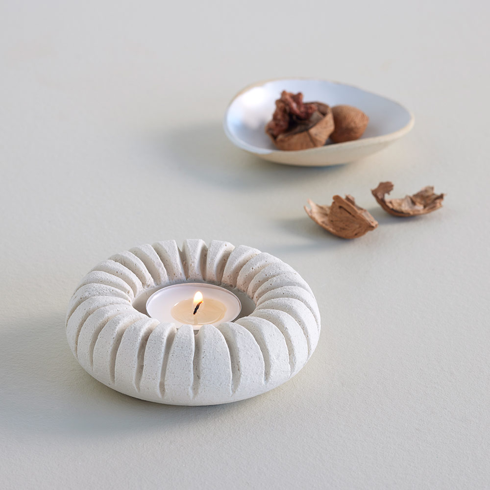 En rustik og stilig lysestake til telys, laget i Jesmonite, et bærekraftig materiale. Leveres i flere farger.