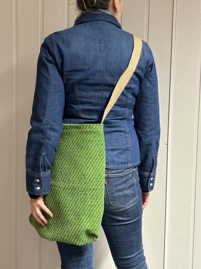 En skikkelig stilig og unikt handlenett eller veske om du vil. Kan bæres over skulderen eller som cross-over veske. Str. 46 x 46 cm, og hank av jutebånd som er ca 96 cm lange.