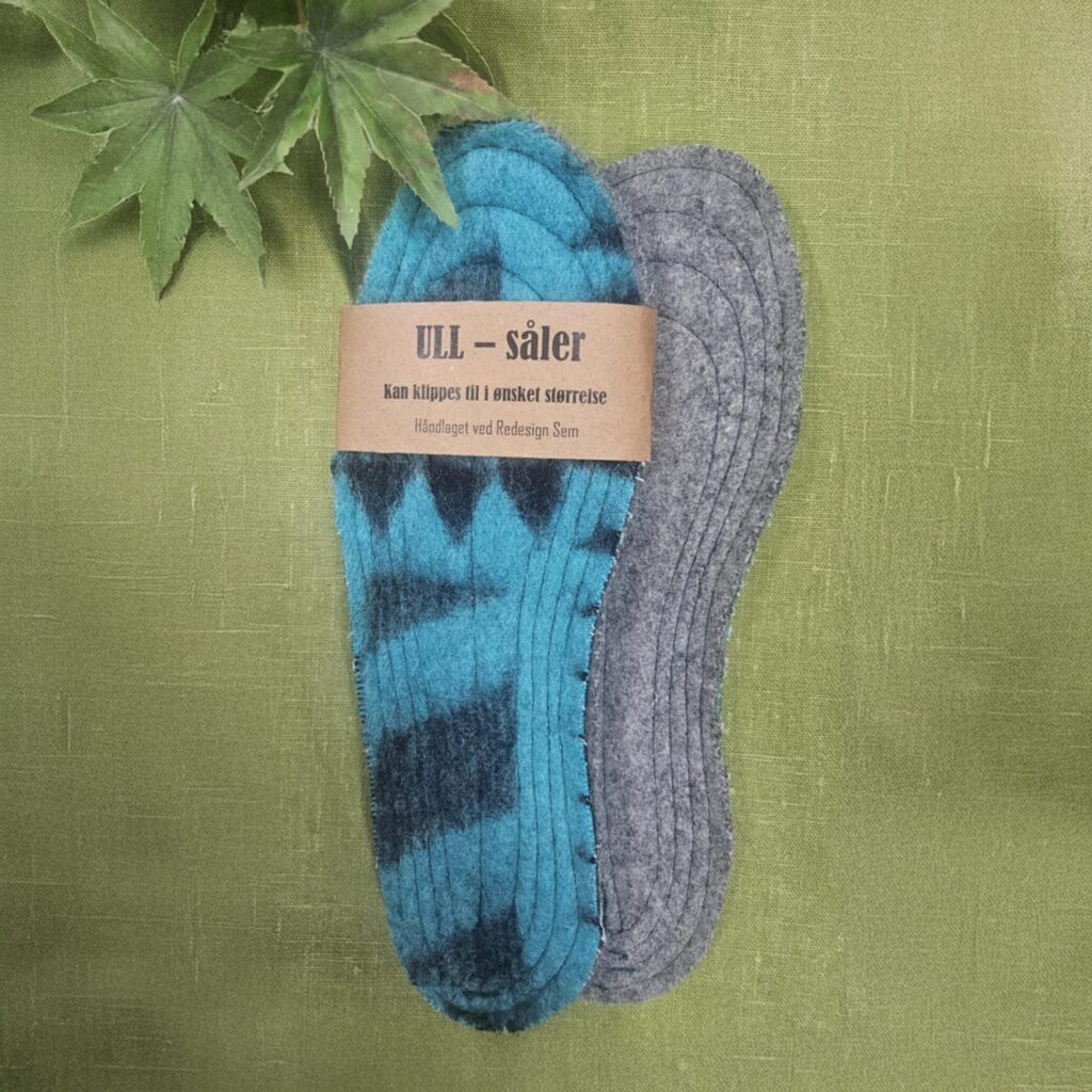 Et praktisk og varmende gjenbruksprodukt; gamle ullpledd som er vasket, tovet og sydd om til skosåler. Sydd slik at de kan klippes og tilpasses din skostørrelse.