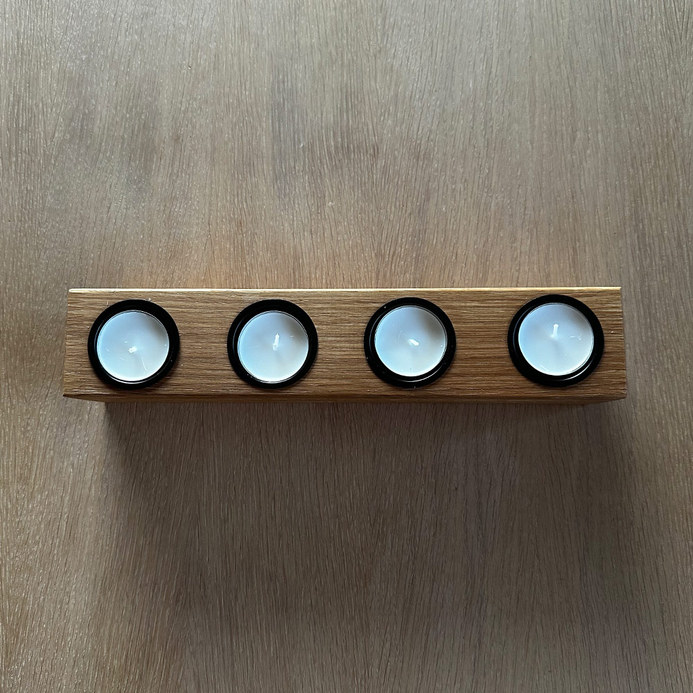 Dekorativ lysestake for fire telys, perfekt som adventstake, laget av naturlig eik i god kvalitet.