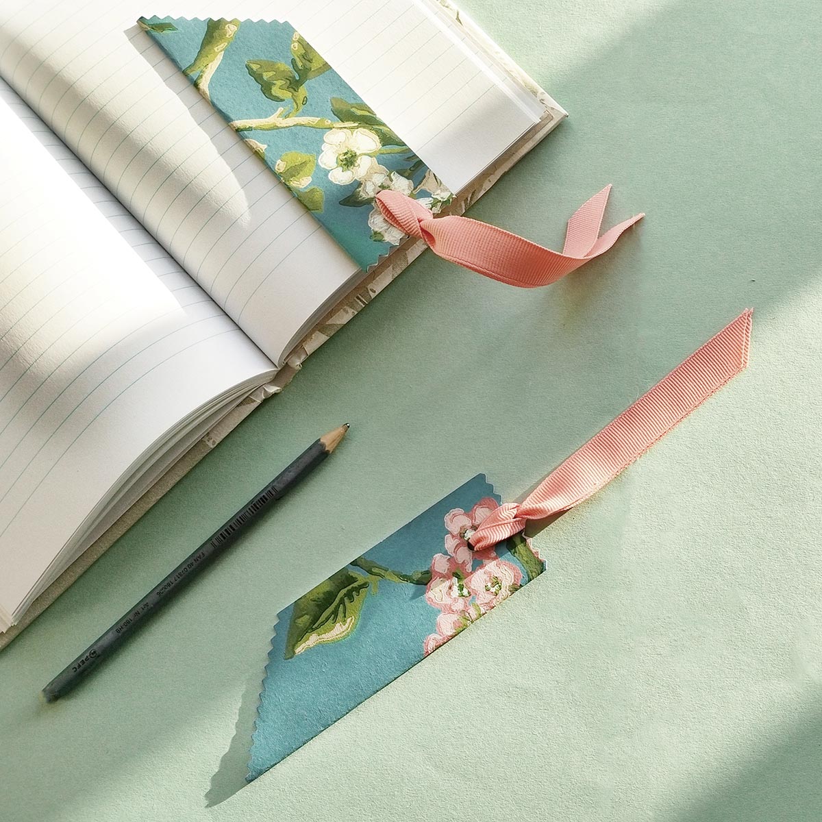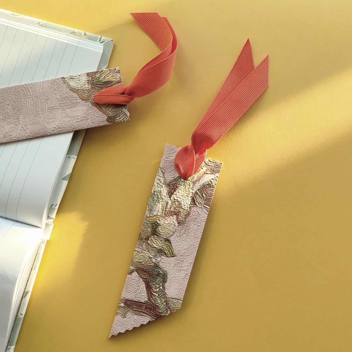 Bokmerket er håndlaget av tapetrester som ellers ville vært kastet.