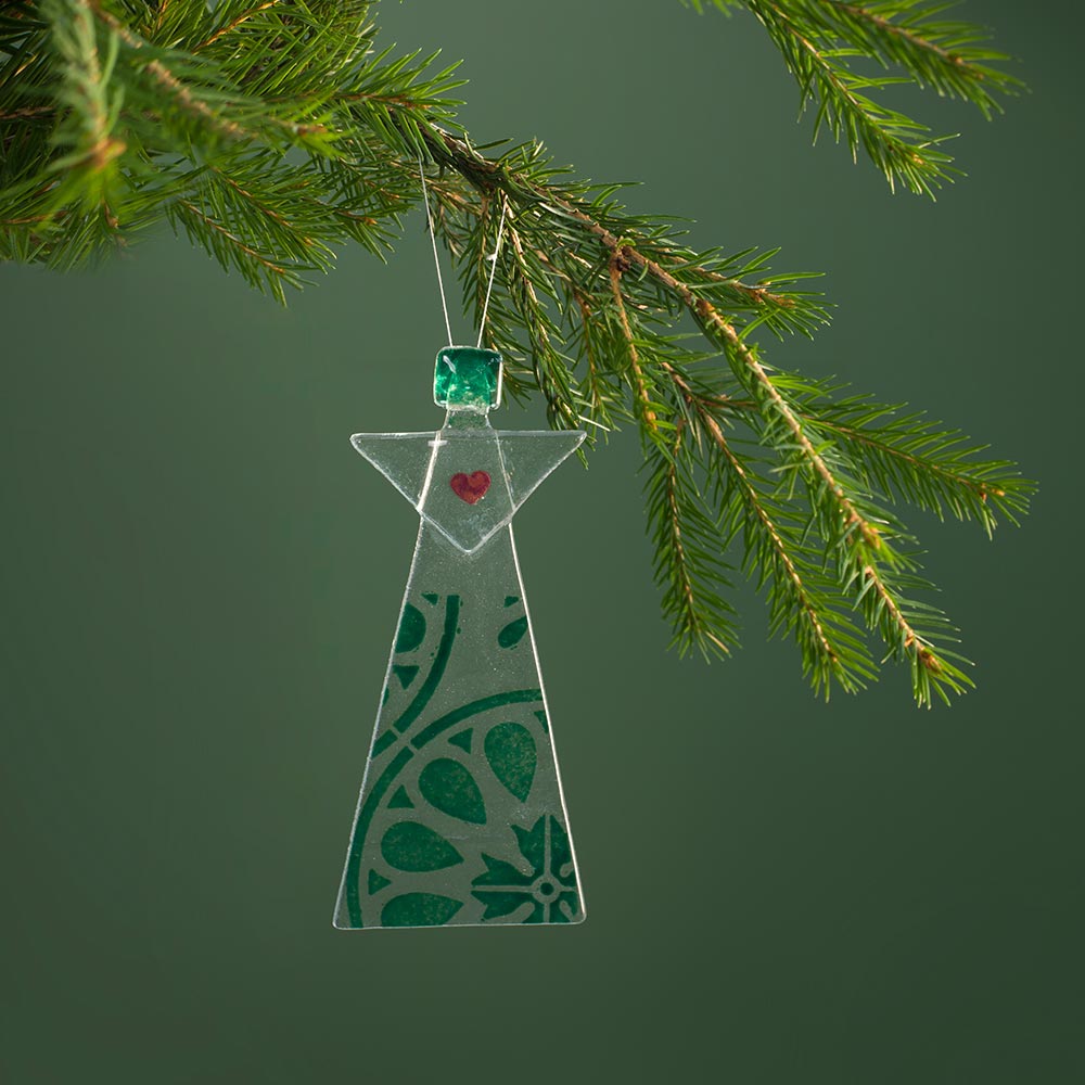 Håndlaget glassengel, laget av resteglass. Engelen er ca. 11 cm lang, finnes i flere farger og har unik sjablong. Selges enkeltvis.