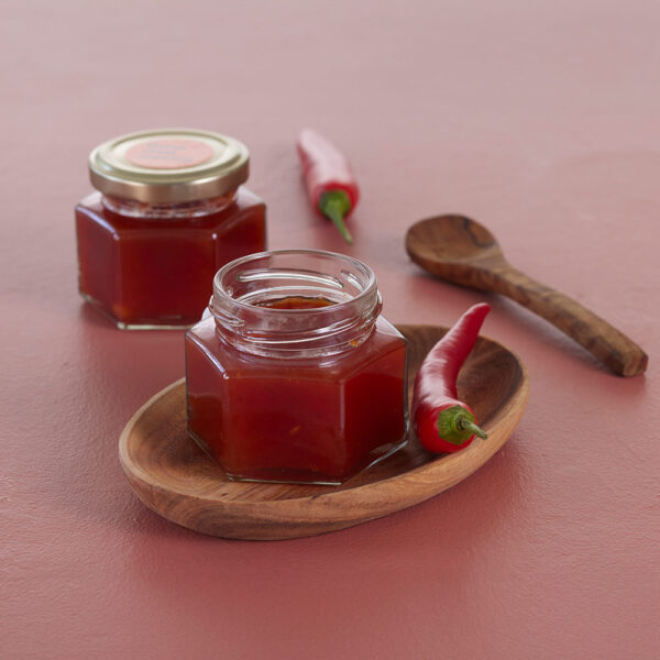 Inneholder: Chilli, paprika, syltesukker, eddik, saft av appelsin