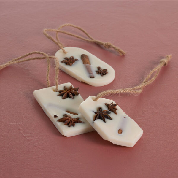 Duftbrikker med deilig lukt av jul. Fint pyntet med stjerneanis. Laget av naturvoks og tilsatt eterisk olje av lavendel. Man kan plassere brikkene der man ønsker god lukt. Leveres i pakke med 3 stk.