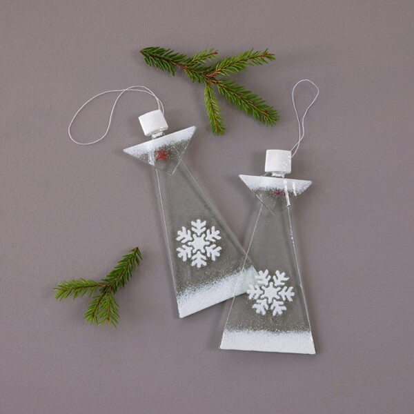 Glassengel med oppheng. Engelen er 11 cm høy og finnes i flere farger med en unik sjablong på hver engel. Selges enkeltvis.