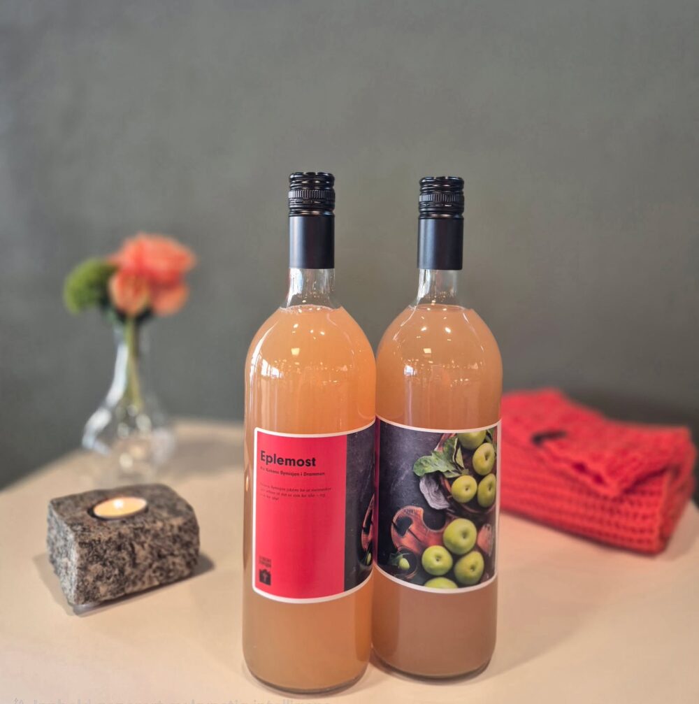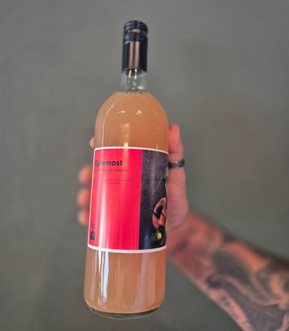 Lokal, ufiltrert eplemost laget av donerte epler – plukket gjennom arbeidstrening i Drammen.