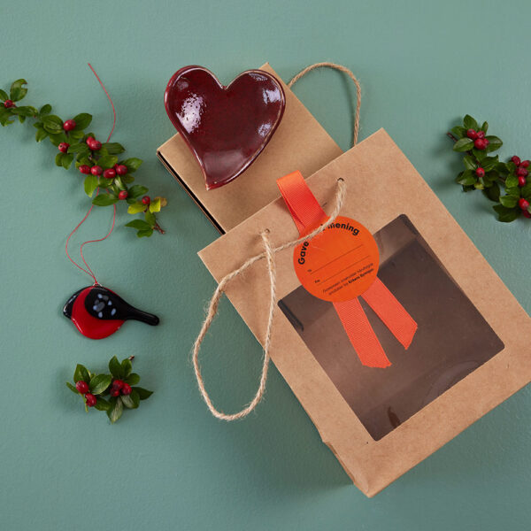 En gavepakke som inneholder en hjerteskål og en dompap i glass, pent pakket sammen i en gavepose.