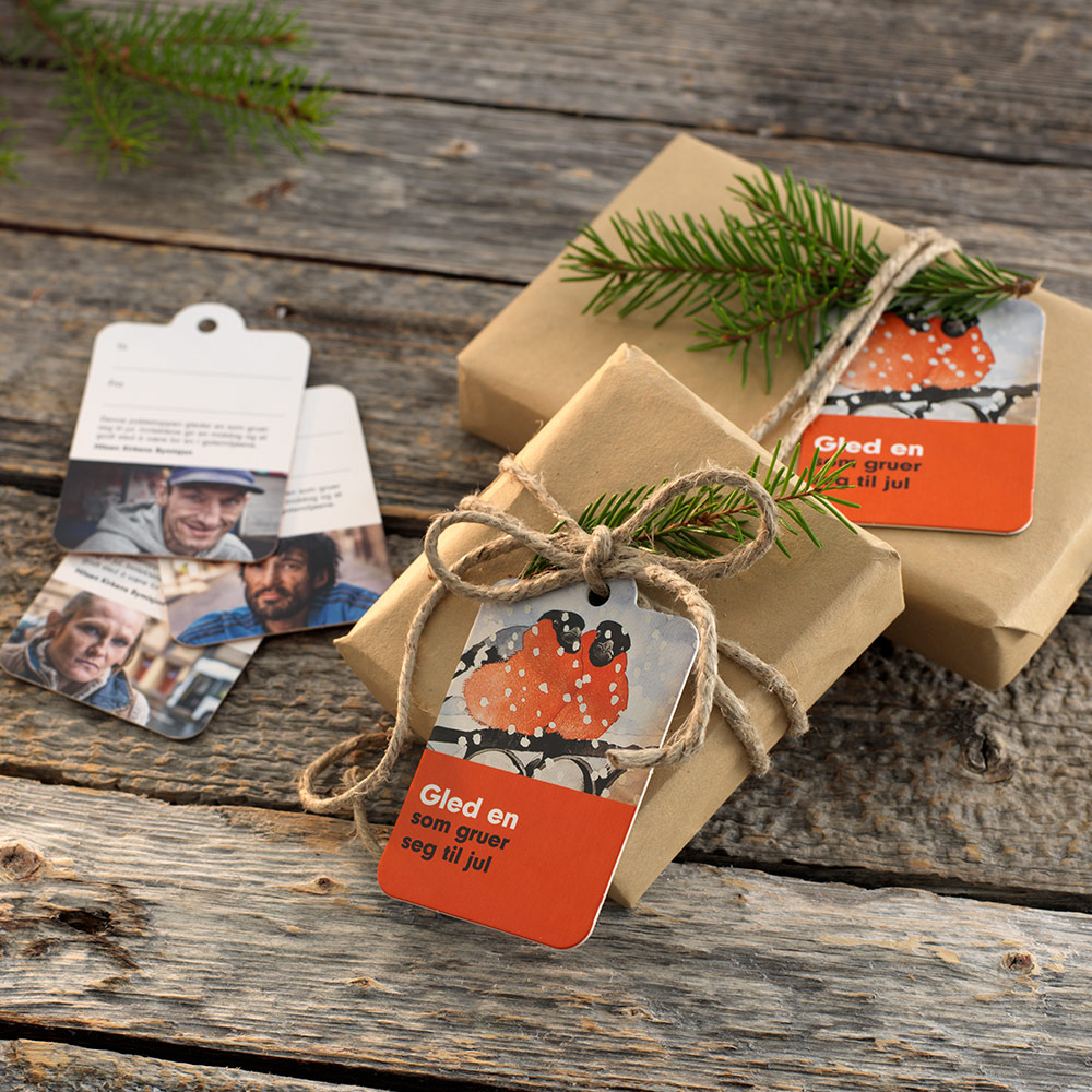 Med våre til-og-fra-lapper på dine julegaver gir du en ekstra gave og gleder samtidig en som gruer seg til jul. En pakke inneholder fem pakkelapper som tilsvarer fem måltider.