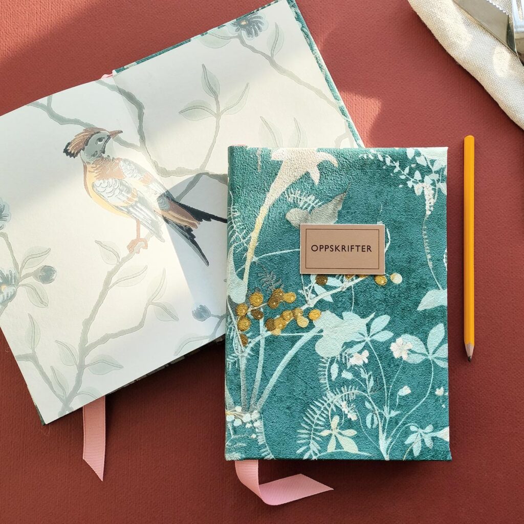 En hyggelig bok for samling av gode ferieminner og hilsener fra gjester. Bundet inn for hånd i tapet. Leveres i flere farger og mønstre.