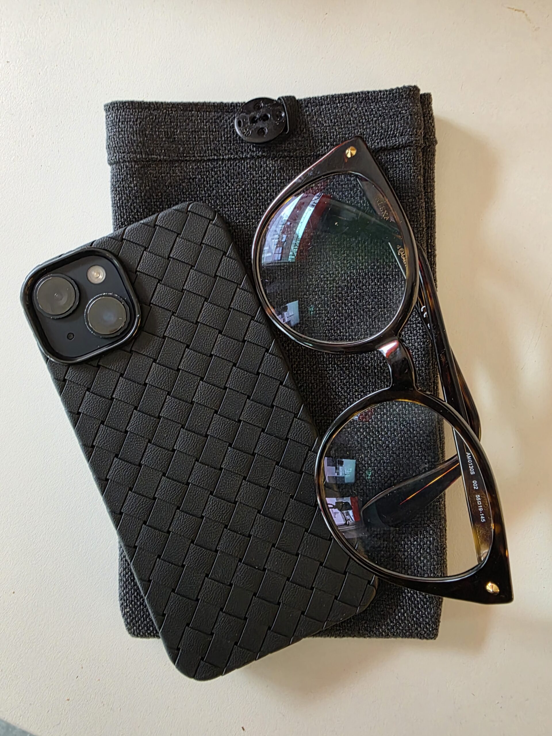 En universell mobilveske, slitesterk og trendy. Håndlaget etui av overskuddsmateriale, til mobilen eller brillene.
