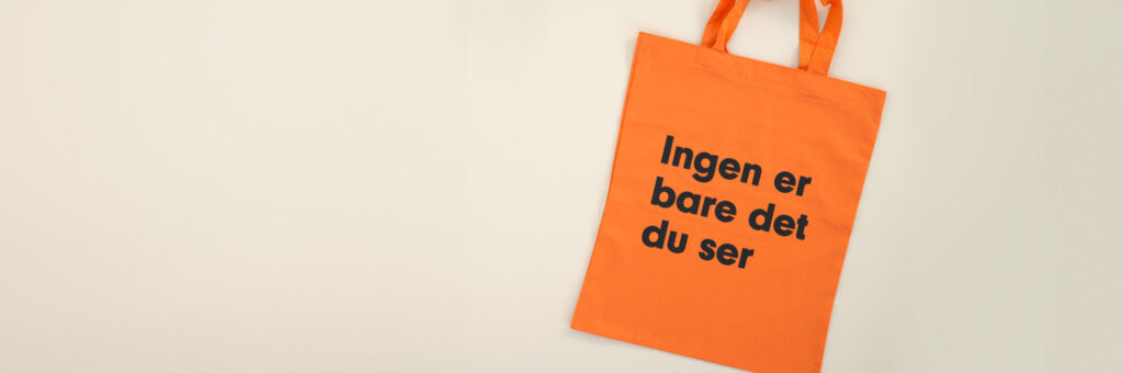 Et nett håndsydd i bomull med teksten «Ingen er bare det du ser» trykket på. Størrelse 38 x 42 cm, og hank ca 40 cm.